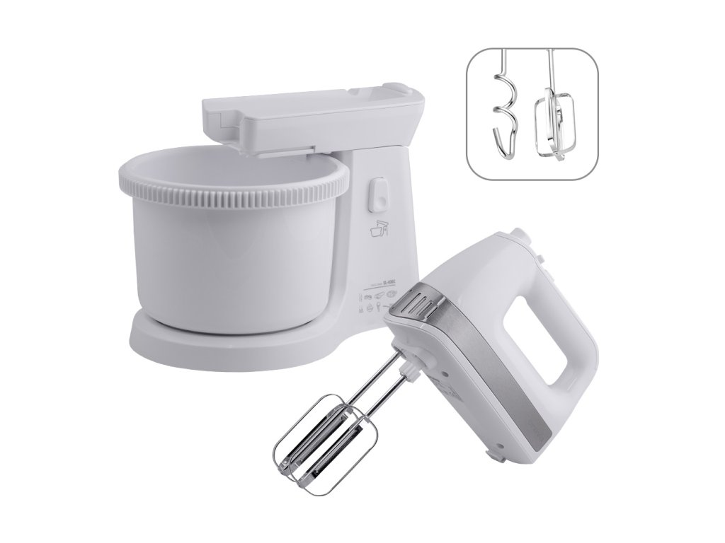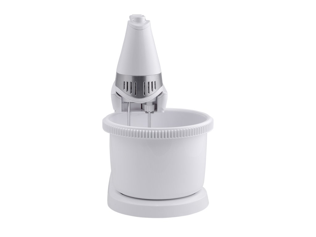 Súčasťou je otočná nádoba s mechanickým pohonom a bohaté príslušenstvo. Spoločne s ručným šľahačom získate tiež dvojicu veľmi výkonných hákov na miešanie a dve metly na šľahanie, vyrobené z ušľachtilej ocele a navyše pochrómované, dosahujú kvalitné výsledky pri šľahaní v krátkom čase.