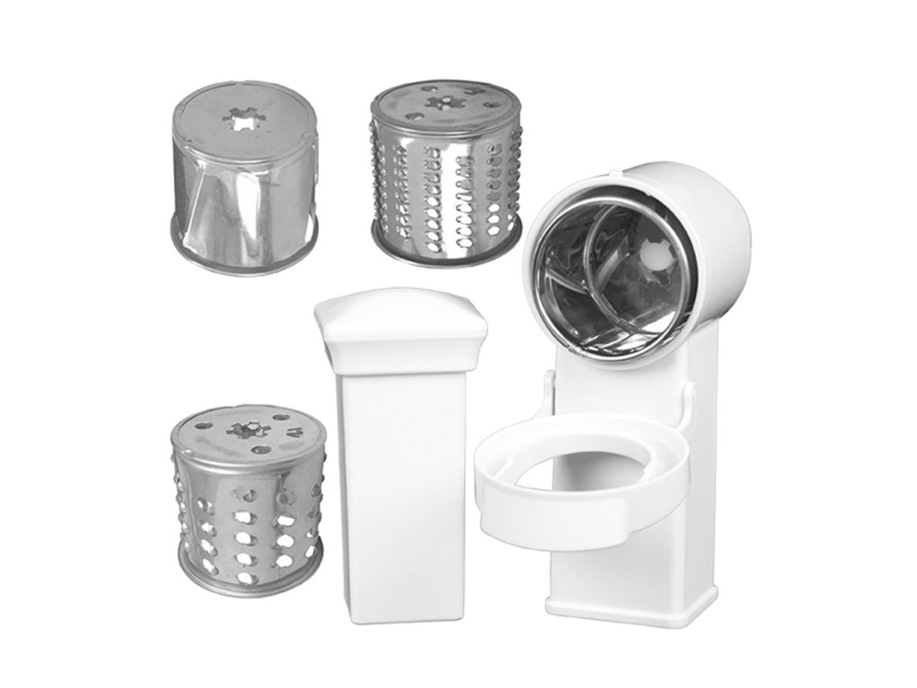 Príslušenstvo k MM-902 - Posúvač - Strúhacia komora - Jemný strúhací valec (3 mm) - Hrubý strúhací valec (7 mm) - Plátkovacie nože